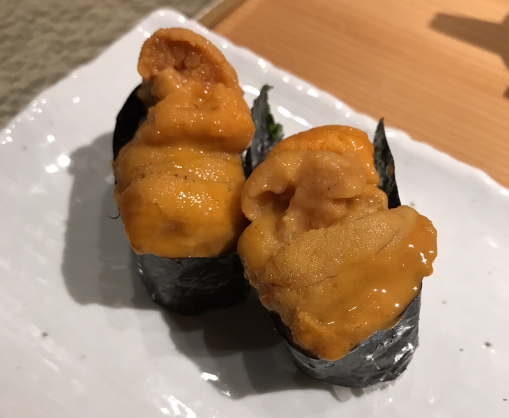 ウニも昔から大好きです。こちらもお店により海苔を巻く軍艦パターンや、海苔を敷く手巻きパターンもありますが、究極は海苔を使用しないパターンですね、しかも醤油でなくお塩で頂くお店などもあり、同じ素材でも食べ方で味わいがスケールします。