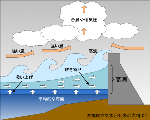 この潮位が高くなるシーズンに台風が接近したりすると、気圧の低下による海面上昇や、暴風によって海水が湾内に吹き寄せらたりすることで、さらに海面が高くなり、沿岸の低い土地では高潮の被害に繋がることになります。