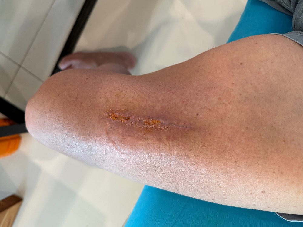 そして、リベンジとなるはずだった11月8日のスンバワ島でも(波伝ハウス滞在)、それほど大きくもない頭半サイズのナンガスのセットにドルフィンスルーをしたら、板が手からスポッと後方に抜けて、波に揉まれている最中にサーフボードのおそらくセンターフィンが左太ももに激しく突き刺さり、パックリと傷口が開いて内と外を合計で48針縫う大ケガを負ってしまいました。