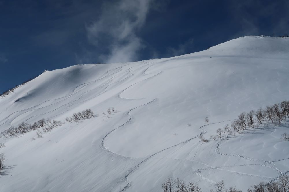 サーフィンのラインは直ぐに消えてしまいますが、バックカントリー(BC)スノーボードのラインは風や雪が強まらない限りは何時間も残っているので、写真に収めることができたり、滑ってきたラインを振り返って仲間やガイドのラインと比べたりすることが容易にできます。あまりにも単純なラインだと振り返ったときに恥ずかしくなったりもしますが、はっきりとその軌跡が残るのがBCでのスノーボードの楽しみでもあり、また苦しみ?でもあるのかもしれません。(笑)