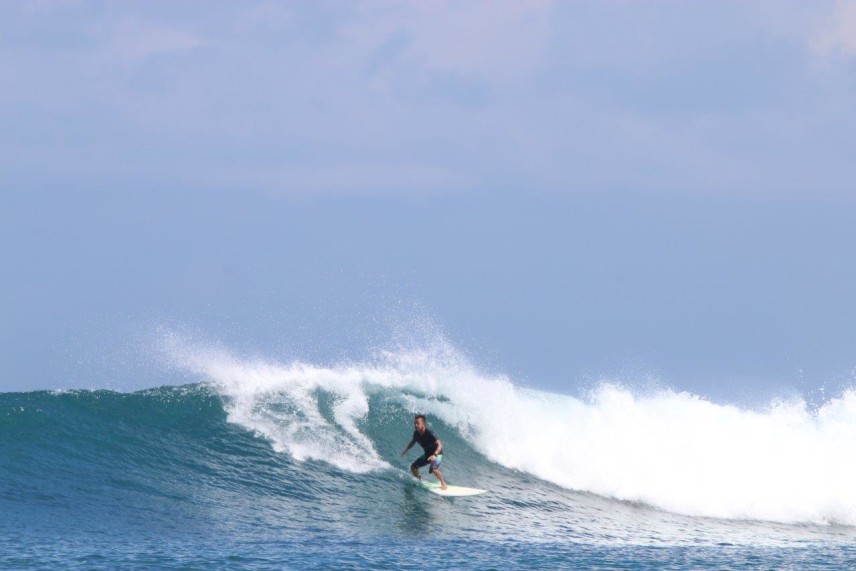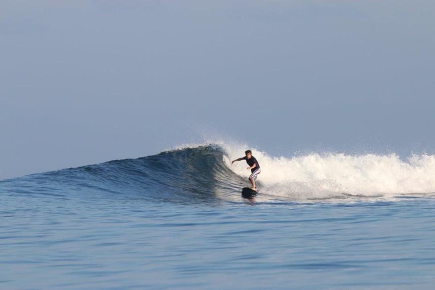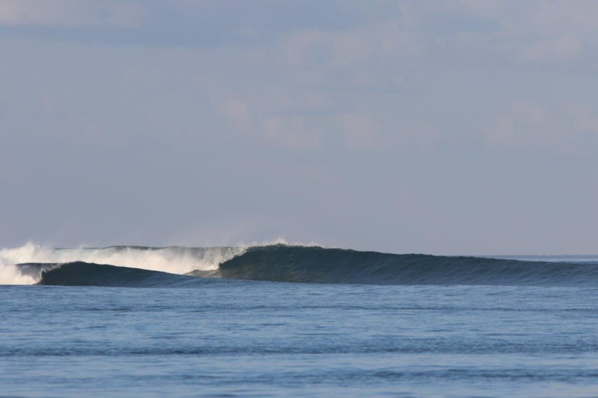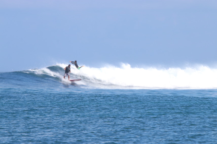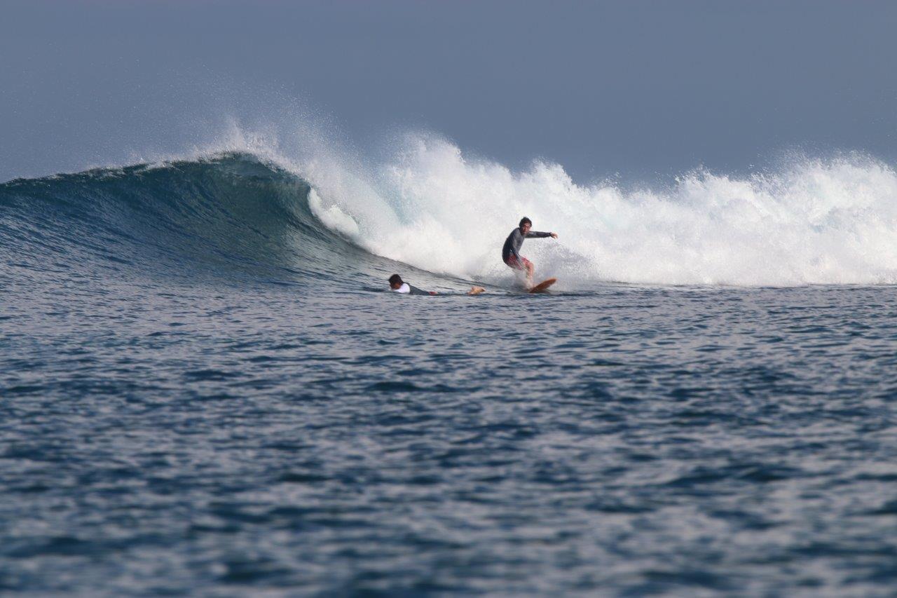 また、今回のExcellent Waveは、先ほど触れましたが最終日に当てた、T-Reefからスピードボートで30分くらいの所にあるライトブレイクの“サッキーママ”でした。ここはT-Reefがオンショアの時にオフショアになる貴重なポイントで、人も少なく、ライトブレイクを楽しみたい方にはお勧めのポイントです。ここも干満に関係なくサーフィンはできますが、少し潮が少ない方が掘れてショルダーが張った良い波が多かった印象です。上手くつなげば100~150mは楽にライドでき、右奥から上手くつなげば200mは滑れていました。