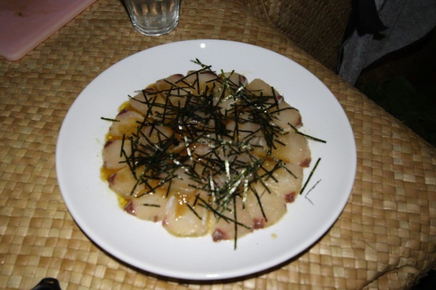 また、釣り名人であるばかりか、料理の鉄人でもあるHisashiさんが造ったお刺身のお造りや、オリジナルの特製ダレが絶妙のカルパッチョ、50万ルピア(約5000円)で漁師から直接買い付けたロブスターの料理など、見栄えも含めて味も絶品で、デュルやクラウスにとってもその料理のレベルの高さを見て感激し、味わって感動していたほどでした。
