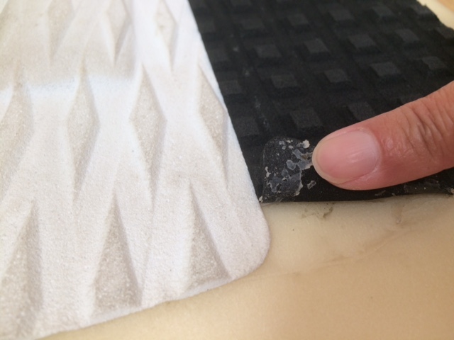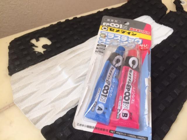 瞬間接着剤に比べると放置(圧着)する時間はかかりますが、エポキシ系ボンドは乾いた後も弾力性があり、水にも強いためデッキパッドの修理にはもってこいです。