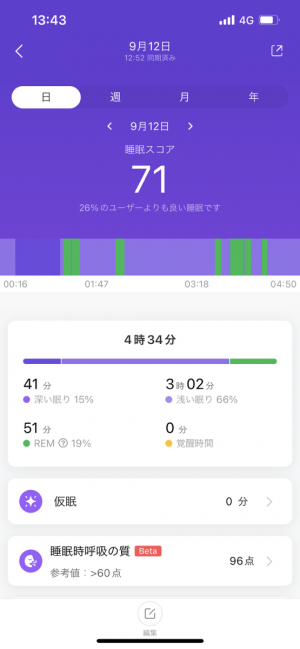 就寝時間中も、深い眠り、浅い眠り、REM睡眠、睡眠時間を計測してくれます。