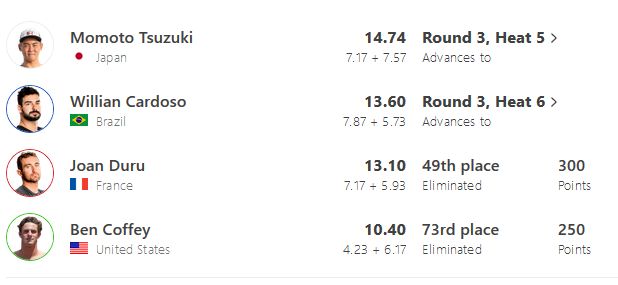 なお、日本人は五十嵐カノアの5位についで、都筑百人プロが37位フィニッシュながら、ラウンド2ではCTサーファーを相手に大金星を納めている。