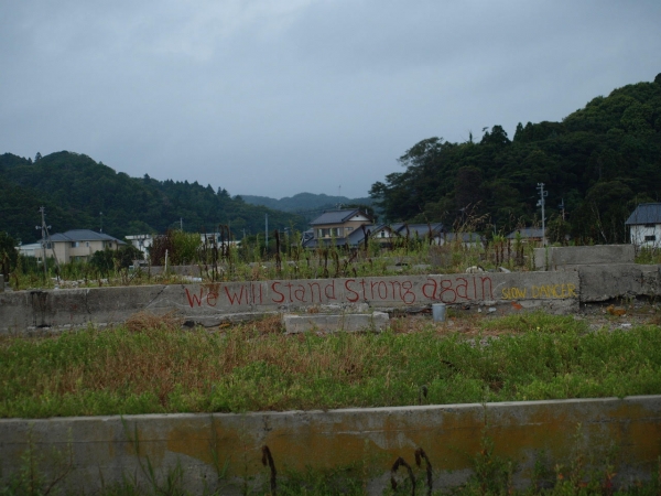 原発の事故は最悪だったね。こんなに厳しいのかって1ヶ月、2ヶ月経って思ったね。こんなに原発の事故が長引くとは思わなかった。生まれ育った場所から周りの人が移っていなくなったよ。少しでも戻って来てくれたらと思った。豊間のサーフィンの良き理解者のおばちゃんがいて、その人の家の基礎の部分に「We will stand strong again」ってペンキで書かせてもらった。