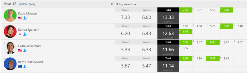 6.20Ptと6.43Ptの合計12.63Ptの2位でRound of 24 – Heat 7へラウンドアップ。