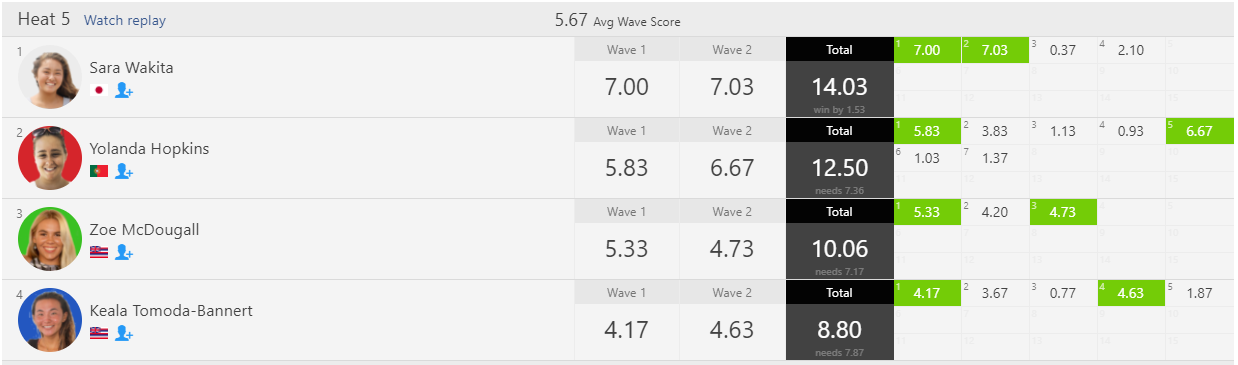 7.00Ptと7.03Ptの合計14.03Ptで1位となりRound of 16 – Heat 5へラウンドアップ。