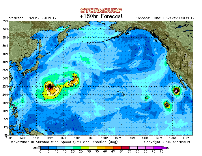 波伝説が世界に誇る波予報ツール・ウエイブハンターによる、7月24日のウネリの周期予報画像です。