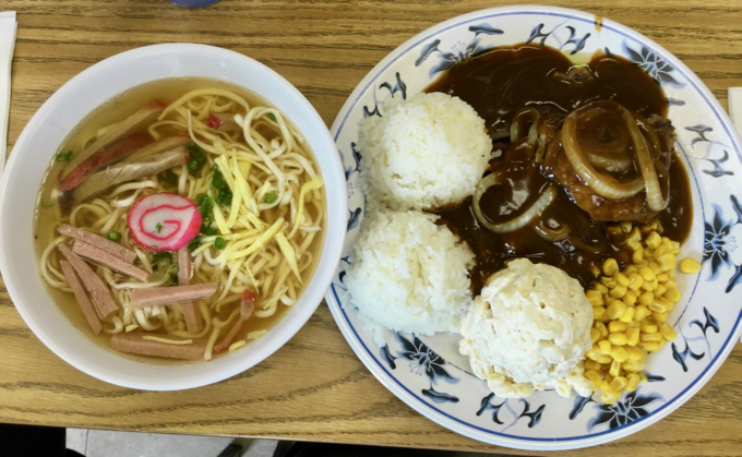 マヒナパパにピックアップしてもらい、恒例ワヒアワランチは、シゲのハンバーグステーキとサイミン〜〜