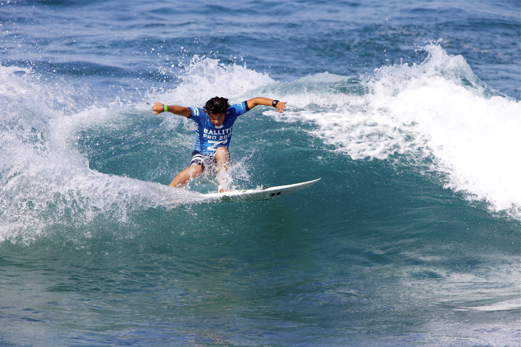 コンテストサイトのウイラードビーチの一つ向こうのブレイクで練習するカノア。