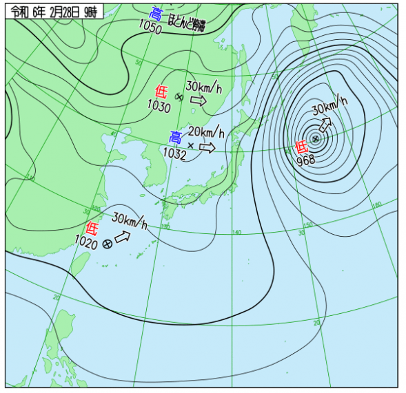 天気図からは、東海上の低気圧が発達しながら、東→北東→北へと弧を描くようにアリューシャン付近に進む時が、大きく反応しやすい傾向でした。