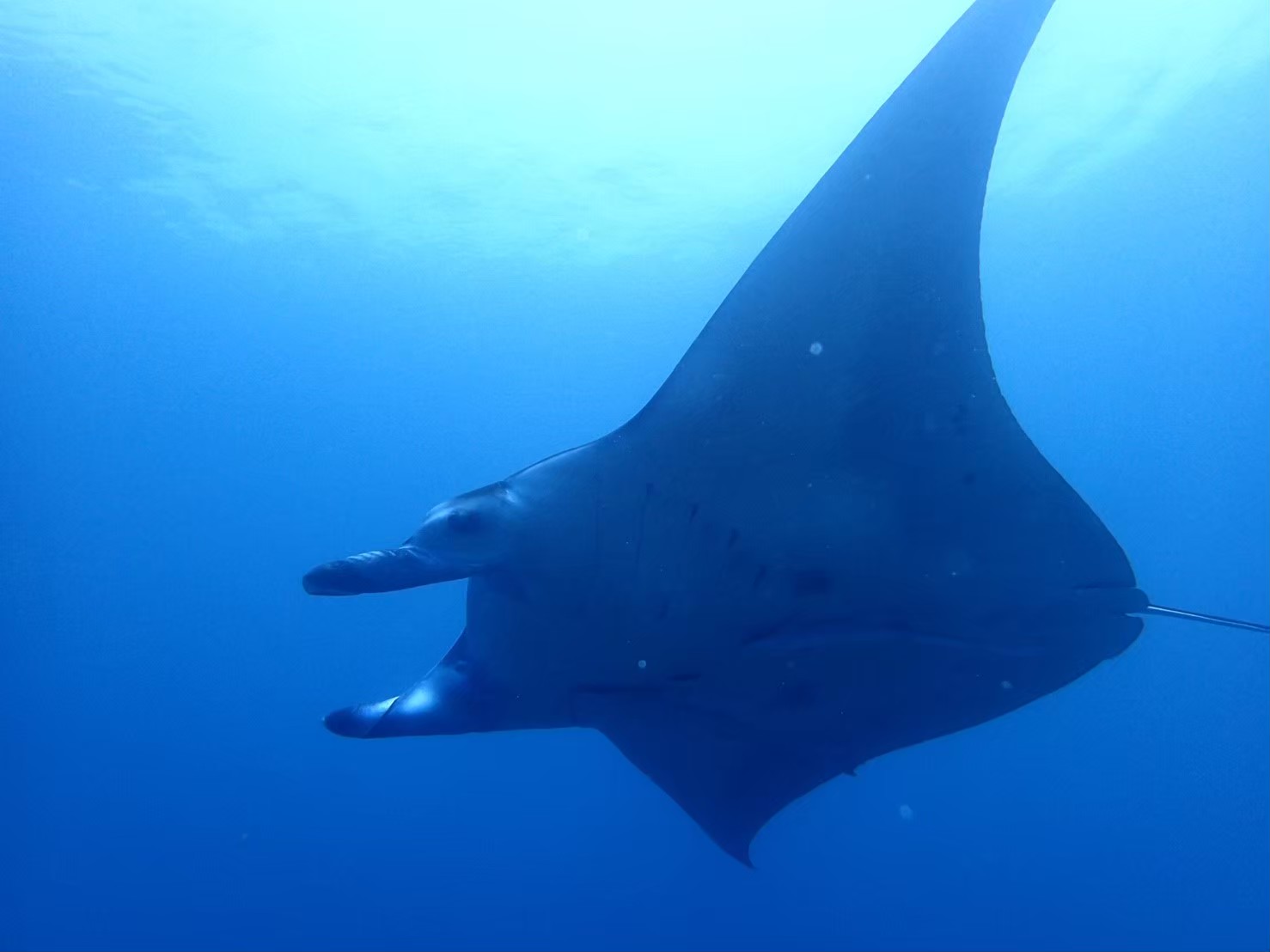 マンタといえば口の周りにある特徴的なヒレ(口鰭=こうき)ですが、実は口鰭は速く泳ぐときには巻きつけています。