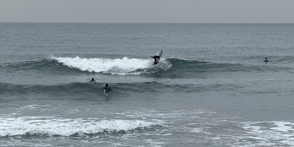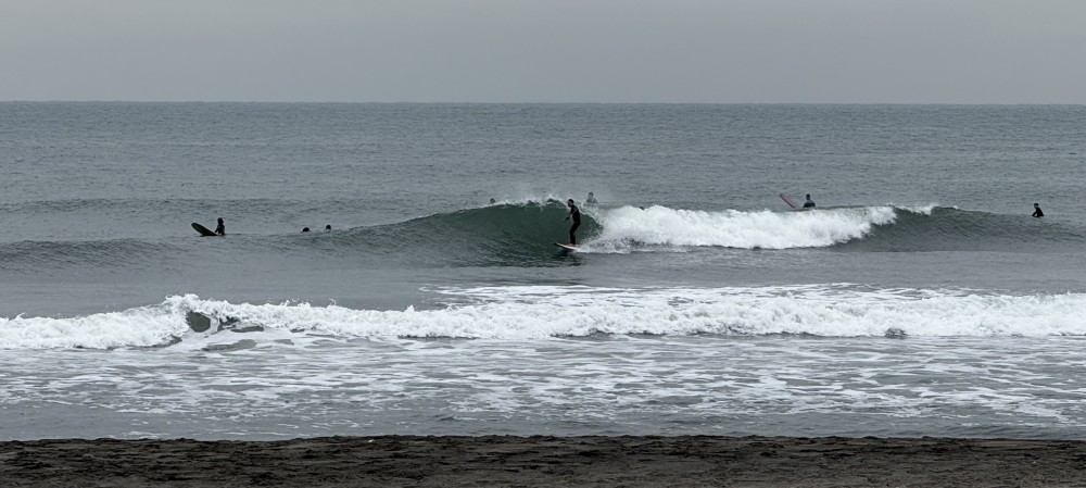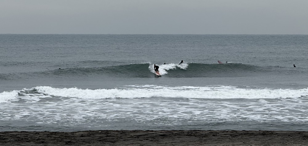 うねりは前日よりもやや弱まっていたものの、時折入るセットは形の良い波。外気温が冷え込み、着替えが少し辛かったですが、急いで入水。