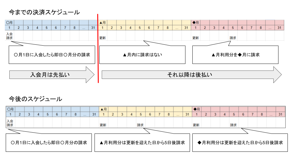 これまではすべてのお客様を対象に「月1回」の一律決済方式をとっておりましたが、今後は月を6つの期間に分割し、お客様の更新日に応じて決済日を分ける方式へ移行いたします。