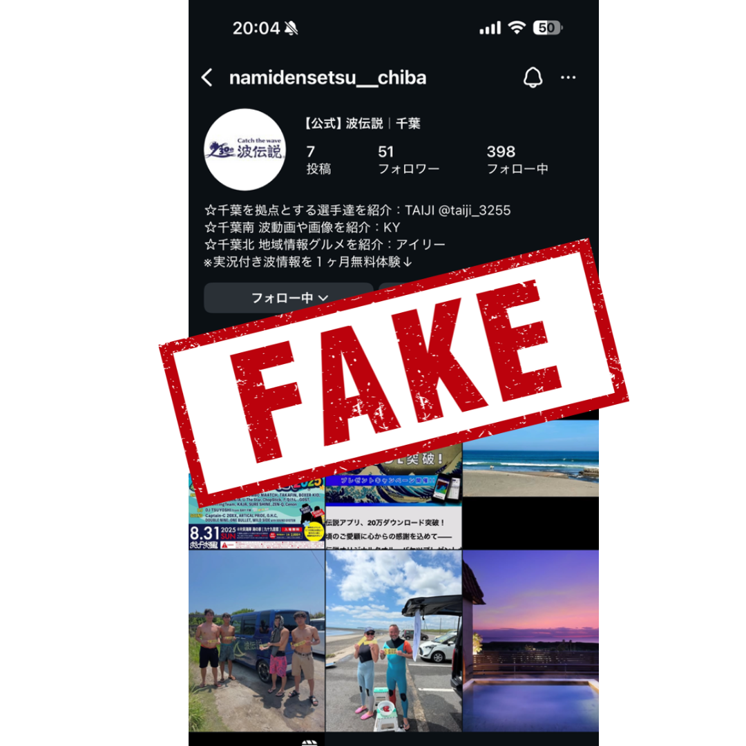 現在、「波伝説」を名乗る偽のInstagramアカウントが確認されております。