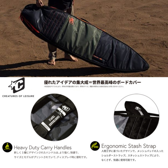 クリエーチャーは従来のボードカバーを2次元から3次元に変更するという革新的なアイデアを考え出しました。サイドウォールにマチ部分を設け、ボードにフィンが付いていてもカバーの中でピッタリと収納出来て、大きなカバーにする必要性を無くしました。このデザインがこれからのボードCoverのスタンダードになります。