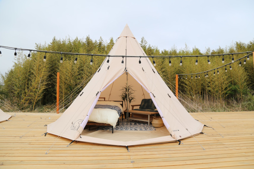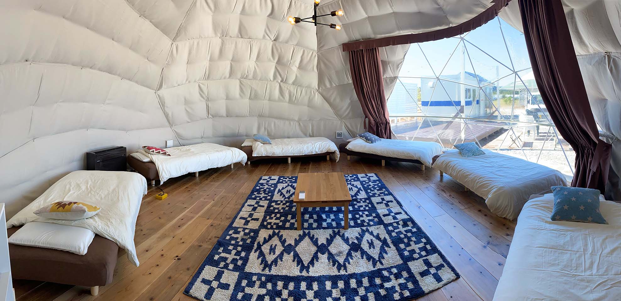 ベッドは各テントに合計8台10名分と寝袋体験セットが10名分で、最大20名様までご利用可能。