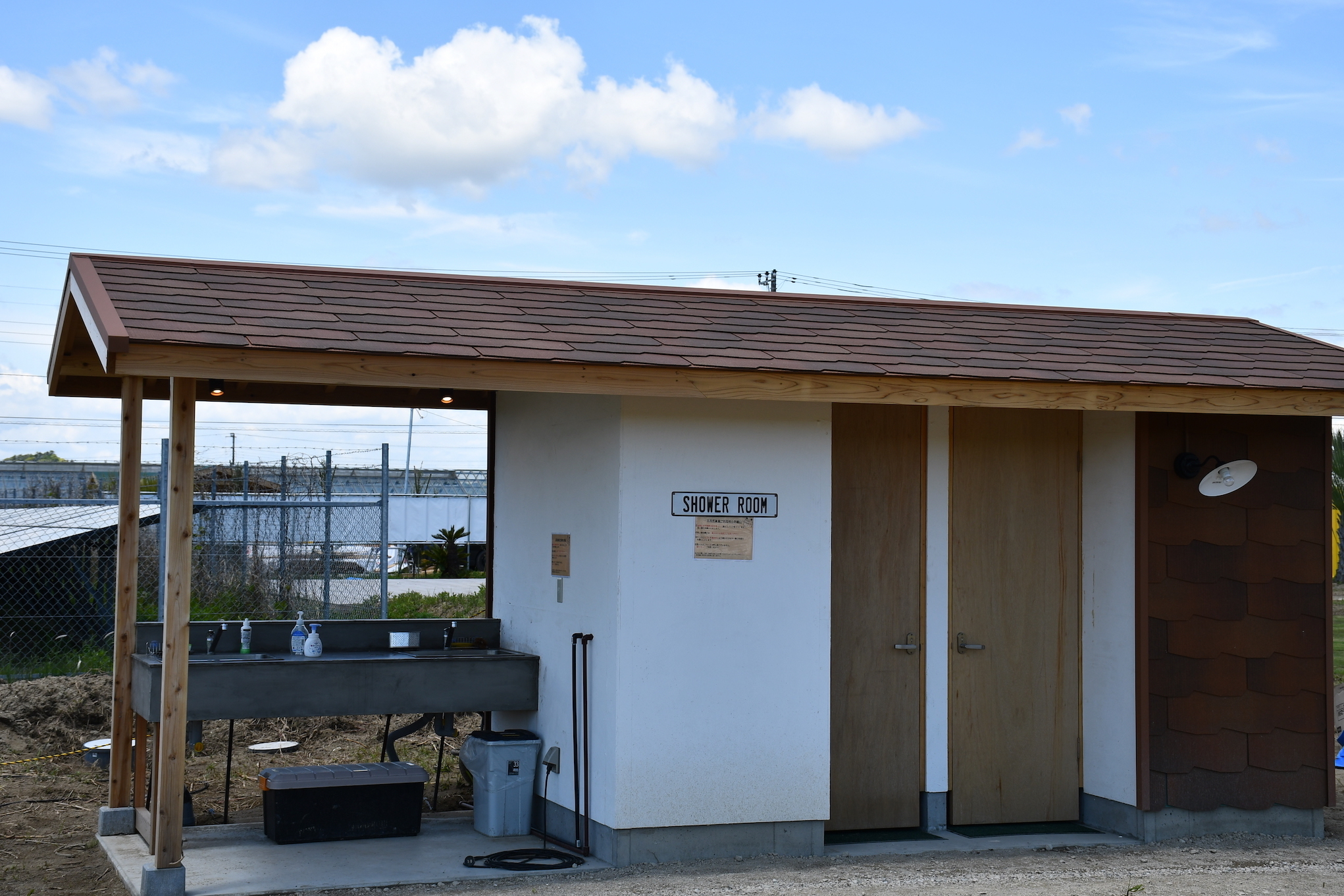 空いているスペースにはご自由にテントも増設可能です。区画専用のトイレ、シャワー、炊事場も完備。