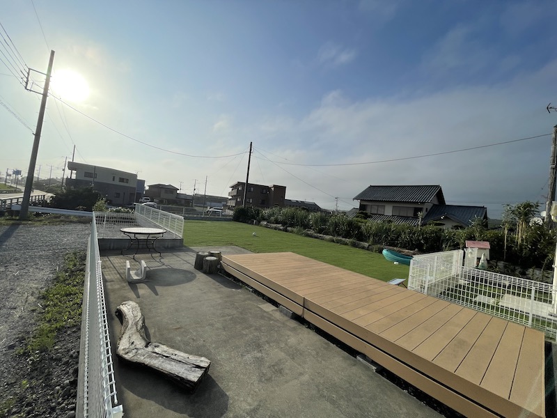 ウッドデッキテラスから、ドッグランへと広がる広大なスペースにてBBQ