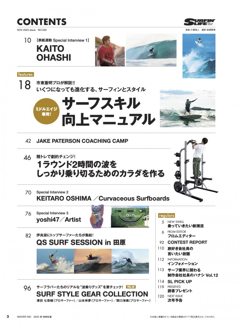 「サーフ業界に関わる制作会社社長のハナシ Vol.12」 / 「NEW SWELL〜乗っていきたい新潮流」 / 「DAISOで見つけた“トレーニング”アイテム」 / 「SL PICKUP」などなど盛りだくさんの内容で皆さんのサーフィンライフを全力でサポートいたします!