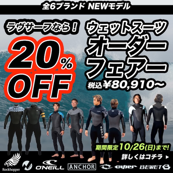 『20%OFF!24~25FWウェットスーツオーダーフェアー』の内容は、ラヴサーフが厳選した6ブランドのウィンターシーズンウェットスーツが対象!