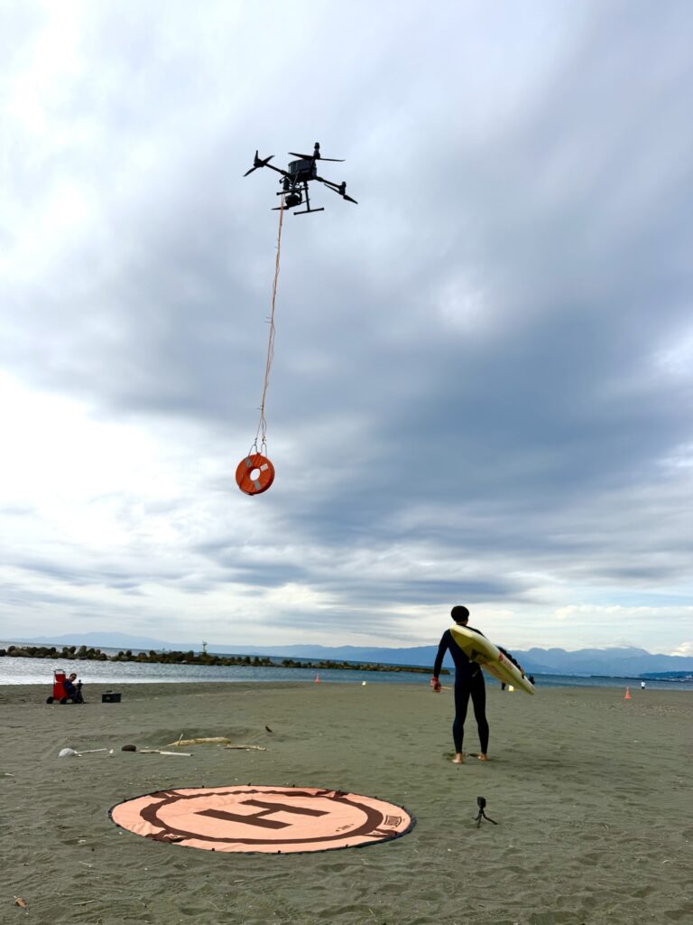 今回は、レスキュードローンという新しい試みとして、ライフセーバーの救助とドローンによる浮き輪投下の速度を距離ごとに比較する検証が行われました。