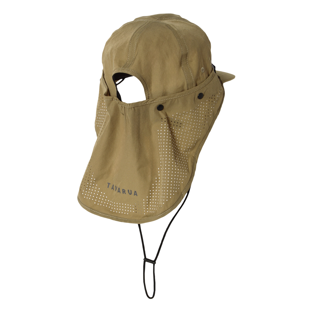 レーザーカット仕様で通気性を確保しながら、首筋までしっかりガード。