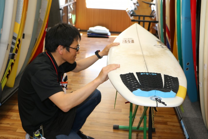 標さんが板の傷や状態、日焼け、ねじれなどをチェックします!